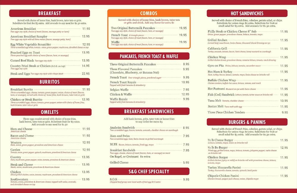 S & G offers a broad menu that excites any diner. Breakfast includes everything from classic American breakfasts to inventive burritos and breakfast sandwiches. Signature dishes like the omelets and pancakes steal the show.