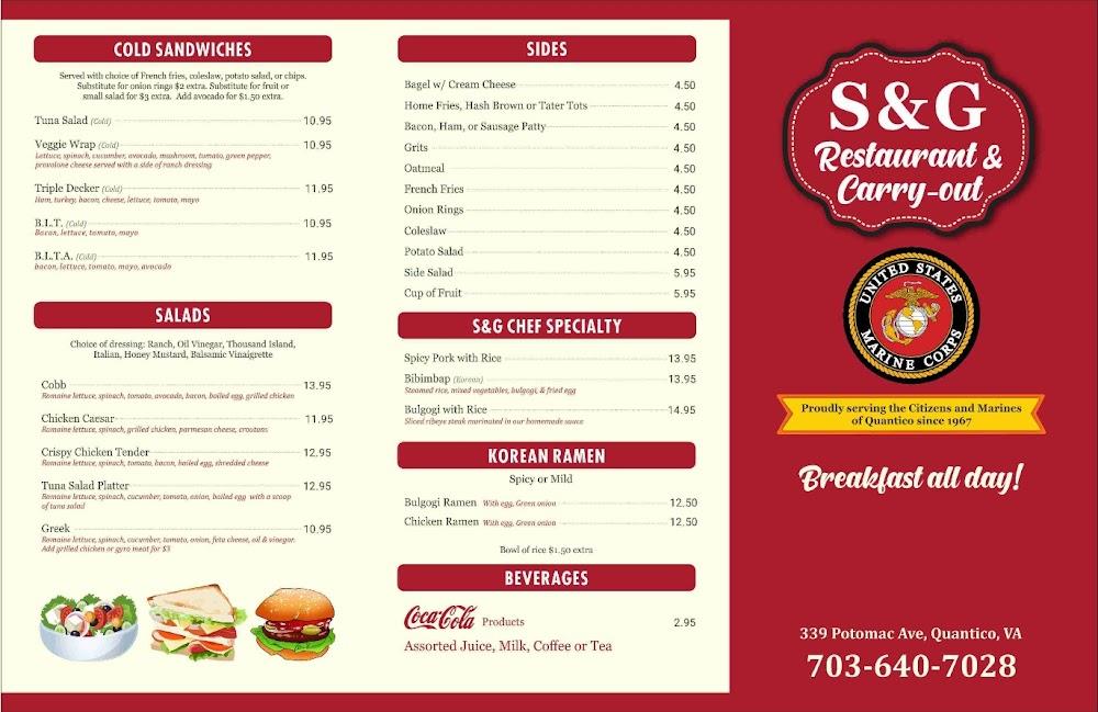 Welcome to S & G Restaurant, your cozy diner in Quantico, VA, where we specialize in hearty, home-cooked breakfasts and lunches. Indulge in our classic pancakes, robust omelets, or juicy burgers, all served fast and fresh to kickstart your day. Don’t miss our tempting weekday specials featuring vibrant Asian cuisine that brings the flavors of the East to your table. Enjoy dine-in or takeout options in a welcoming atmosphere with wheelchair accessibility and ample parking. With breakfast and brunch at the heart of our menu, S & G Restaurant is perfect for solo diners and families alike. Come taste the difference!
